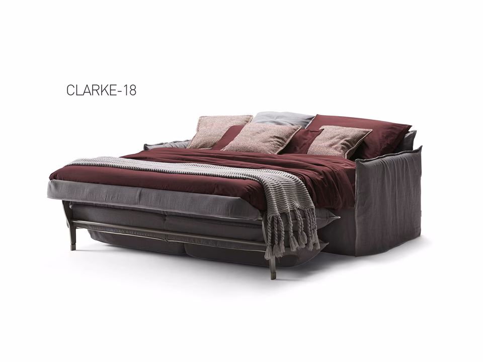 Sitting or sleeping has never been more comfortable with the Clarke, sofa bed with Lampolet mechanism: a large choice of different 14 or 18 cm thick mattresses, beautiful design and extreme seating comfort. The cover is completely removable and washable according to the fabric chosen. Clarke is also available as a sofa and can be completely disassembled for easy delivery.