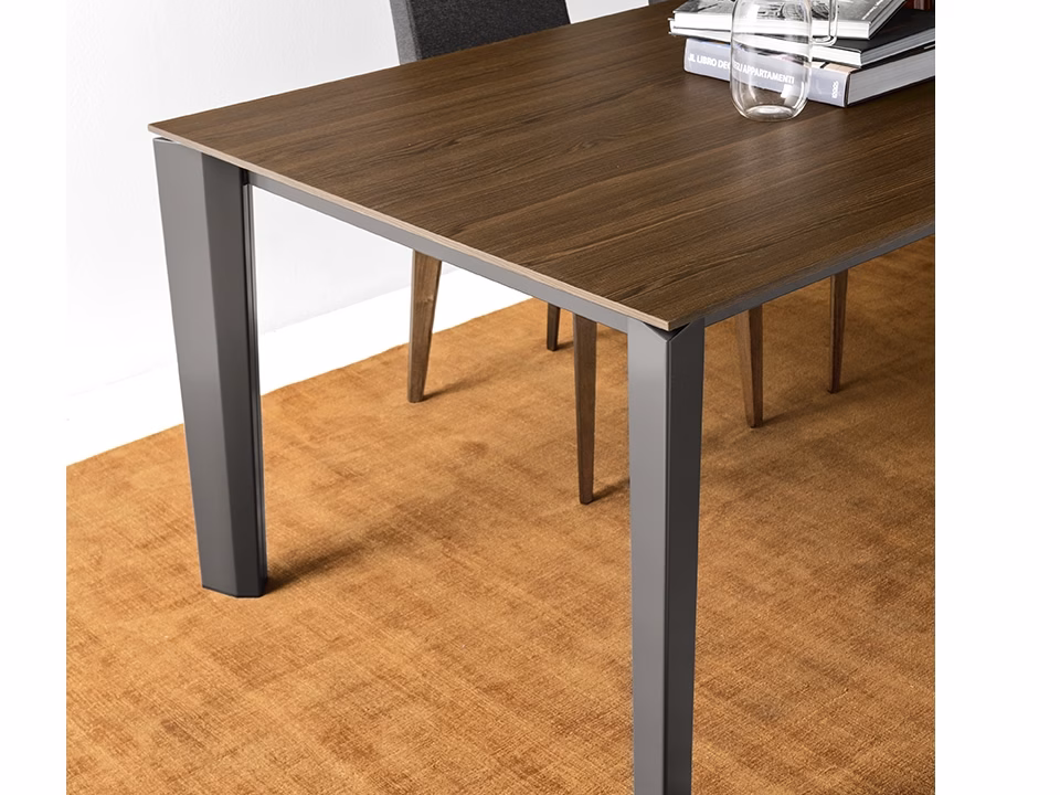 DELTA extending table with metal legs and wooden top. The DELTA table features slant-cut legs anda wooden top that extends along guides. Legs always remain at the corners of the table offering maximum comfort to all guests. Discover all the available finishes!