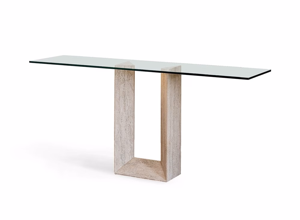 Console with Travertine (TN) or white Carrara (BC) marble base. Clear glass top 12mm thickness. The top is laid on the base.