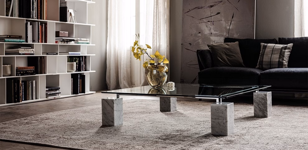 Coffee table with base in white Carrara (BC) or black Marquina (NM) marble. Chromed (08) or black (OP17) metal bars. Clear glass top.