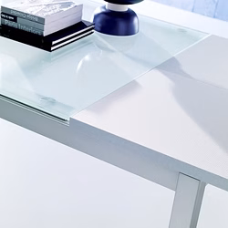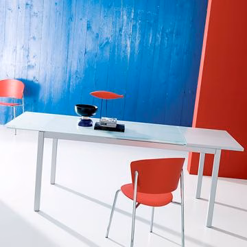The Diesis Extending Dining Table by Bontempi has a minimalist design that is sure to suit any dining space without clashing aesthetically with other furniture. As an even further testament to its versatility, table tops are available in either melamine wood or sandblasted glass.