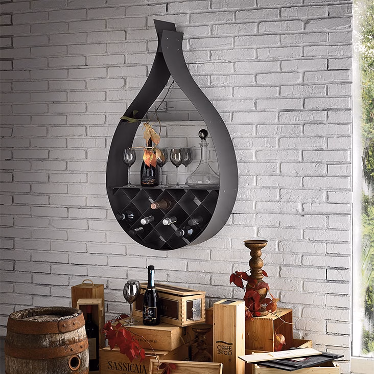 Wall bookcase/wine rack in matt black (OP17), graphite (OP69), white (OP71) lacquered steel or in polished stainless steel with rack and shelf in matt black (OP17), graphite (OP69) or white (OP71) varnished steel or titanium (GFM11) embossed lacquered steel with rack and shelf in matt black (OP17) varnished steel.