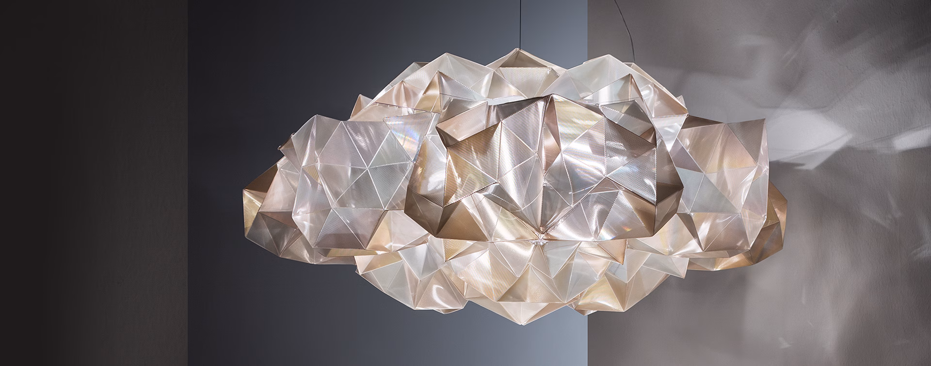 Drusa draws inspiration from crystals poking out from crevices in the rocks; they exhibit an ever-changing, poetic and multiform kaleidoscope when hit by the light. The contemporary, chromatic angles accentuated by Lentiflex® finished with a Silky print, are muted by the central light source, that not only gives depth to the design, but creates harmony between light and shape. Drusa, resembling a diamond, is available in suspension and ceiling versions, and with its infinite chromatic shades, brings a fresh, trendy feel to any space.