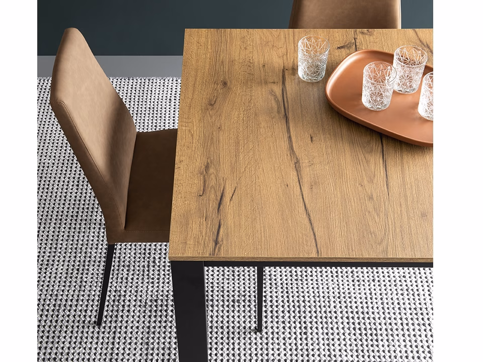 Non-extending DUCA table: metal frame and top available in wood veneer, ceramic or tempered glass. Simple and elegant, it has legs positioned at the corners for guaranteed sitting comfort. This table is an ideal way to elevate the dining area.