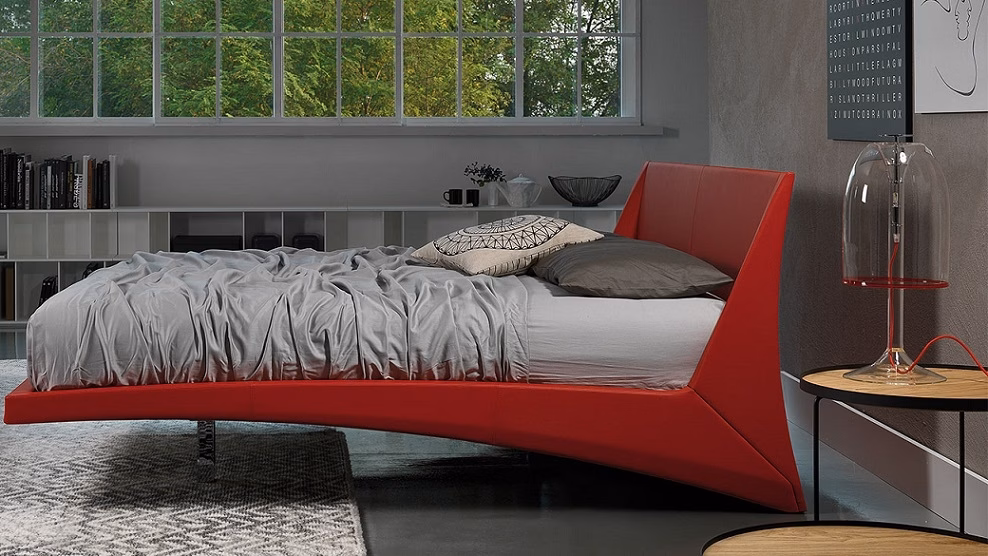 Upholstered bed covered in fabric, synthetic nubuck, micro nubuck, synthetic leather or soft leather as per sample card. Chromed (08) steel feet. Slats included.