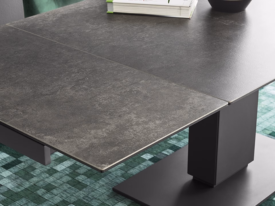 ECHO model extending table. Rectangular glass top. Central pedestal base. ECHO is an extending table with a rectangular tempered glass top and rounded sides. The pedestal base provides maximum comfort to all the guests and the metal base offers high stability. The 2 lateral extension leaves can be removed individually, just pull towards you and slide them from underneath the top and align them with a simple movement. ECHO is a functional extending table (it can accommodate up to 10 people) with a stylish design.