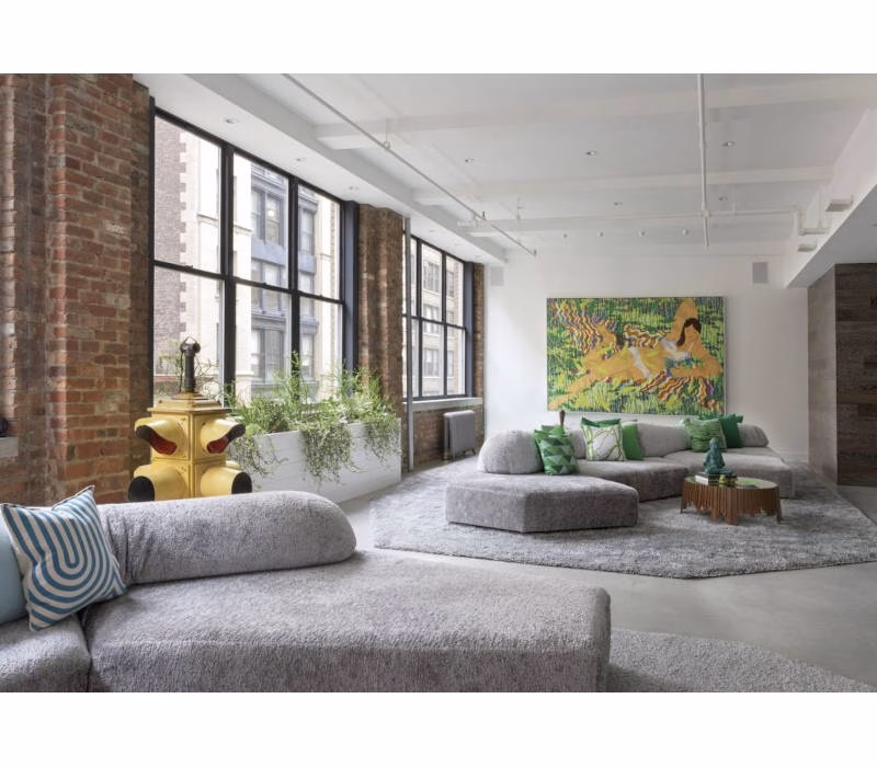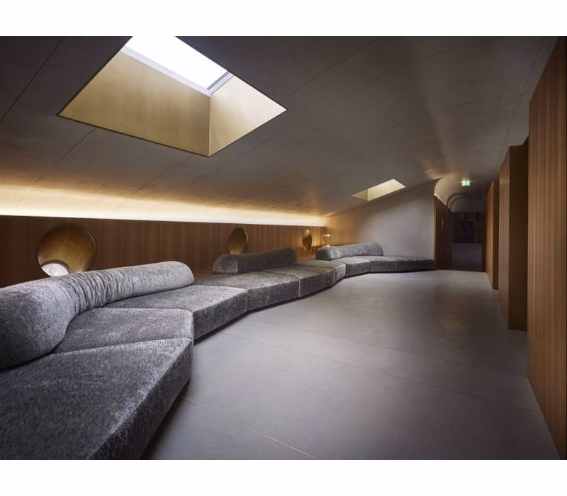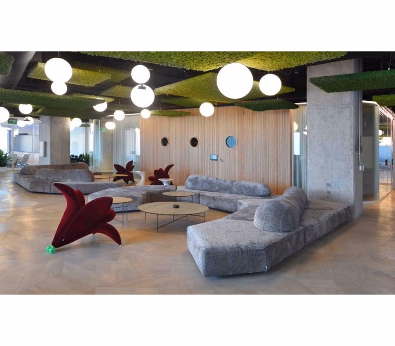 Wide, with no stiff structures, with four seating elements in different shapes and two backrests, separated from the base and in different sizes that can be arranged as you prefer.