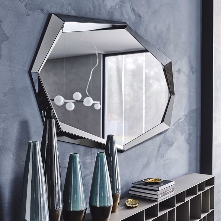 Wall mounted mirror in mirrored glass or fumé glass. Mirror is equipped with plates for horizontal or vertical installation.