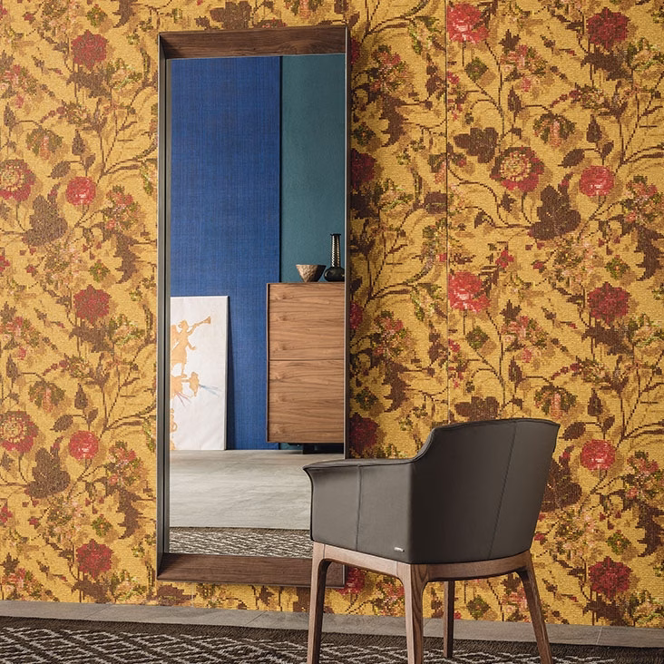 Wall mirror with frame in solid Canaletto walnut (NC) and graphite (GFM69) or black (GFM73) embossed lacquered steel. Mirror is equipped with plates for both horizontal and vertical installation.