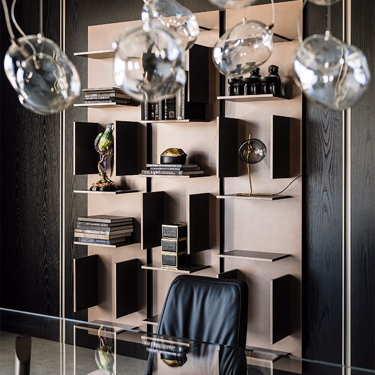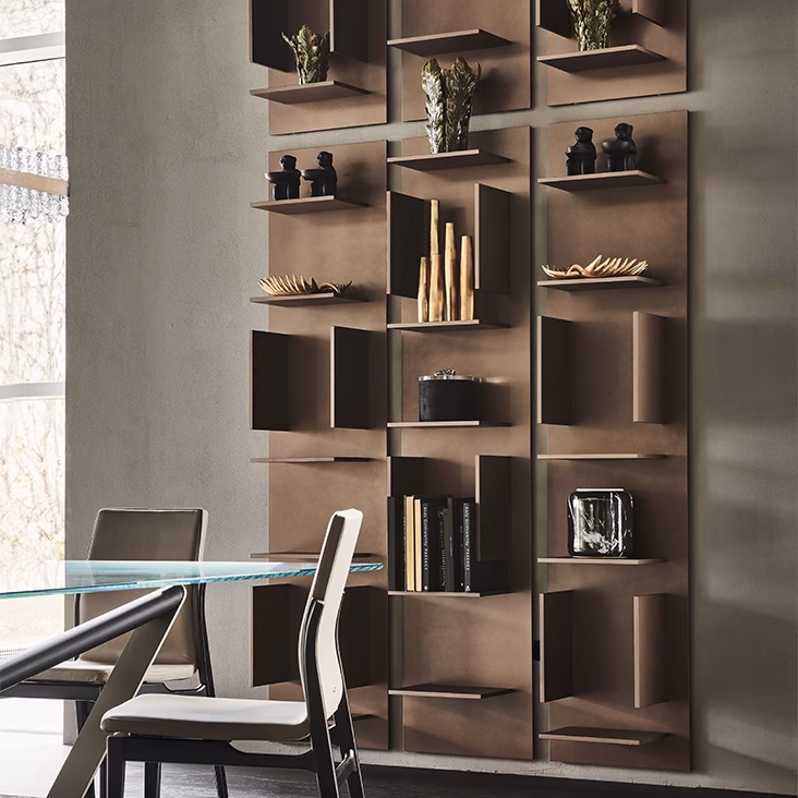 Modular wall bookcase in bronze (GF15) or white (GF71) lacquered embossed wood. Supplied with wall brackets for upside/down hooking.