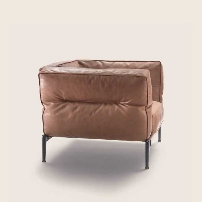 The Adda armchair possesses the same straightforward, contemporary aesthetic as the seating system of the same name. Generous cushions with goose-down padding and piping that underscores their soft, welcoming shape offer delightful visual contrast to the light metal structure. The cushions are creased with a unique lengthwise stitching detail that produces a slight wrinkle in the surface of the upholstery – which can be crafted in fabric or leather. In addition to following the natural fold created upon sitting, the stitching lends Adda a distinctive look. The armchair rests on a metal base covered in leather or fabric, while the exposed cast-aluminum feet reveal their graceful, yet absolutely contemporary vibe.