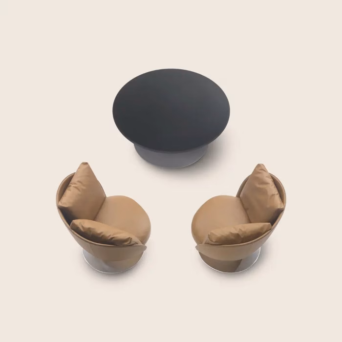 Elegantly uplifted jacket lapels inspired the delicate design contours of the Eri family of products, which includes armchairs, ottomans and coffee tables. Featuring a soft, enveloping style signature, each of the Eri versions is thoughtfully designed to encourage a satisfying sensation of relaxation. Perfectly at home with the eponymous stool and armchair, the Eri coffee table features a metal base available in an array of elegant finishes. The tabletop can be crafted in solid wood or in a wood veneer version with back-painted glass insert.