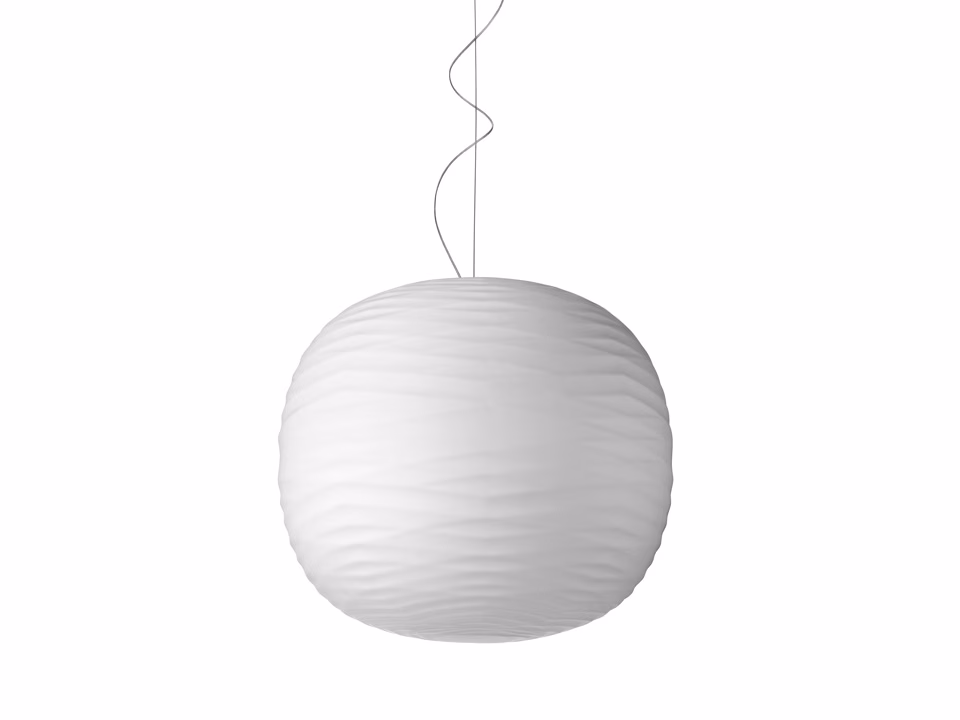 A fluid vibration on glass. The Gem suspension lamp is a seductive object that declares at first glance the superior value of the material and the fine craftsmanship of its manufacturing process. The irregular glass surface, with waves and reliefs that change continuously, makes this lamp unmistakable even when switched off, creating unexpected lighting effects when it is switched on