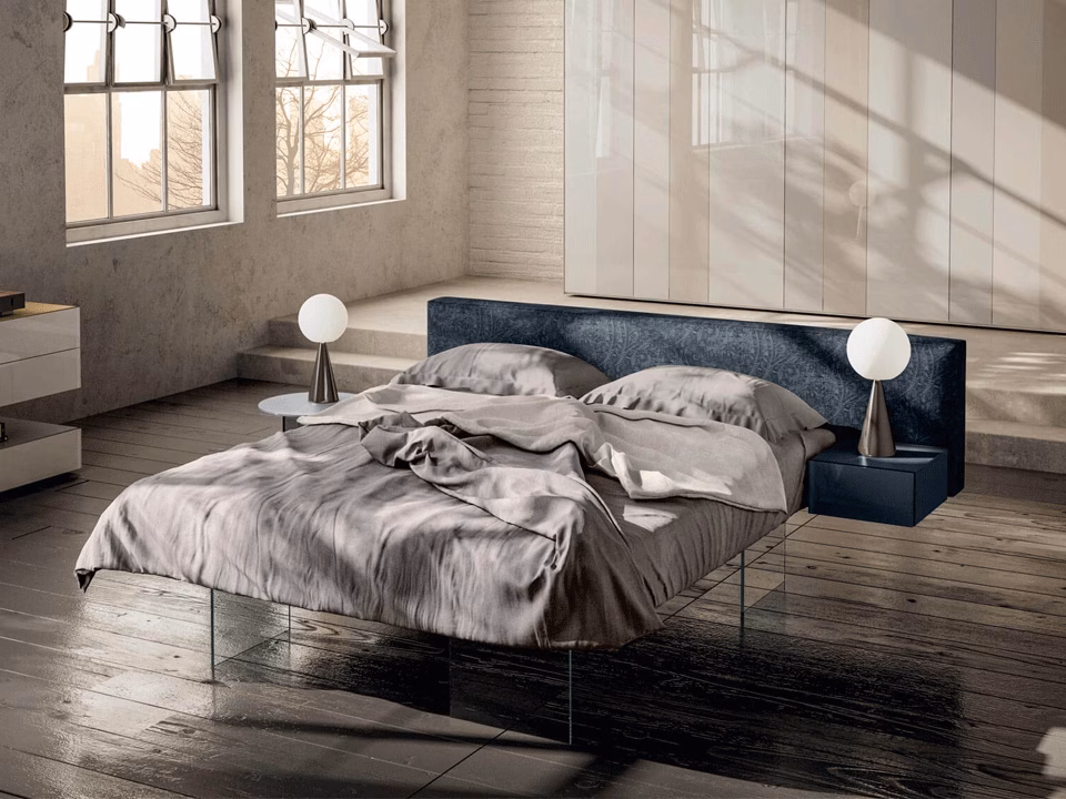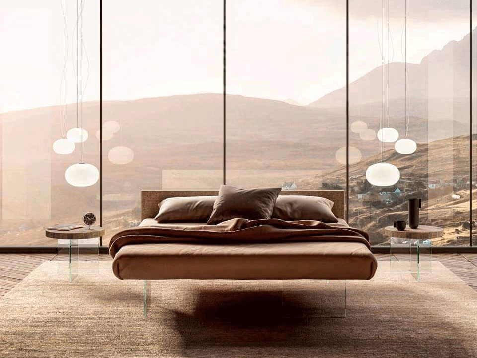 The bed seems to levitate off the ground, creating the feeling of sleeping in a cloud. The platform of the bed is suspended on four nearly invisible glass legs that give it a strong feeling of lightness. In all of its sizes, double, single and three-quarter, Air is an elegant, refined bed perfectly suited to any interior.