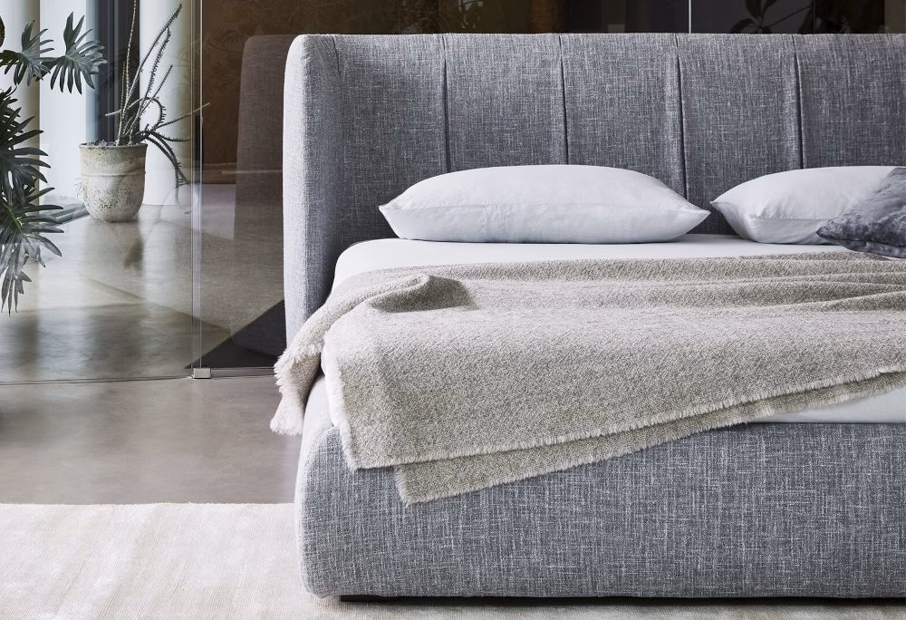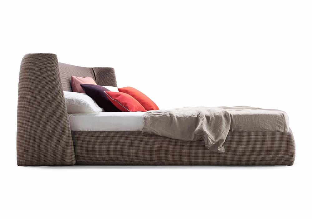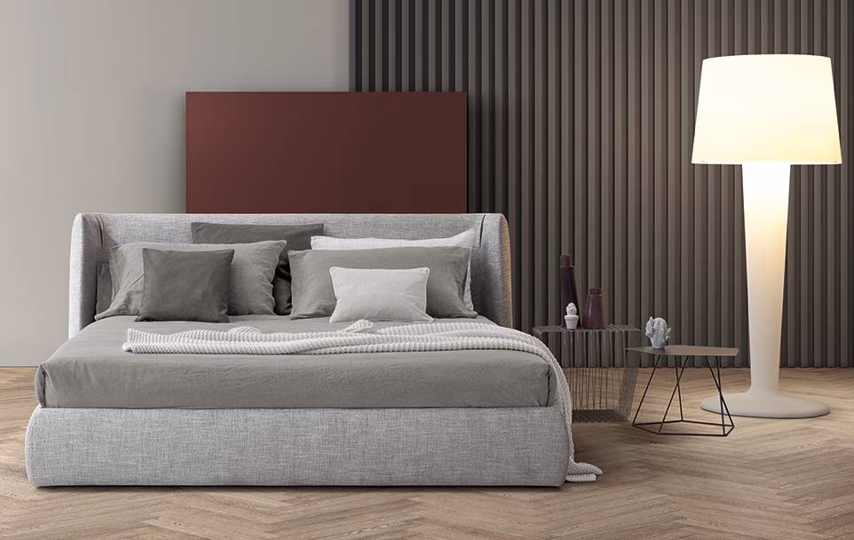 The Basket bed is designed by calibrating large shapes with soft, enveloping lines. This is a double bed covered in fabric, leather or eco-leather, completely removable. There are many variations to the design: in addition to Basket, the Basket plus model, featuring sophisticated tucks on the headboard; Basket high, which displays the sophistication of the volumes, thanks to the more imposing headboard; Basket air, the lines of which are slender in the painted metal feet; Basket air plus, with metal feet and headboard adorned with tucks are all available. The Basket, Basket plus and Basket high are also made in the “open” version: the practical unit enables precious additional space to be gained for storing covers, cushions and everything necessary for the bedroom.