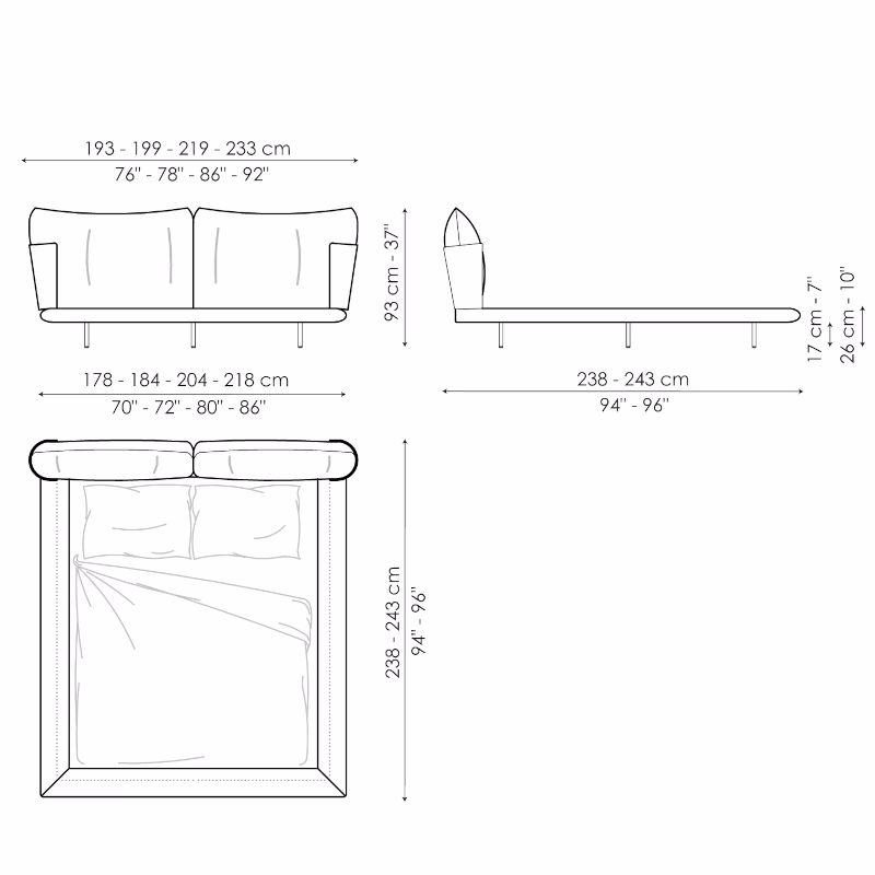 Blend bed: a strong and distinctive item. A headboard that plays on the combined design of an emery leather part and the softness of the cushioning. The composure of the structure adds value to the upholstered part, creating a rigorous line that widens upwards from the bottom, merging with the welcoming padded headrest, consisting of two big cushions. The overall effect is of a solution characterised by an elegant image and a soft composure. The leather structure is an important aesthetic feature, a sort of frame that uses research into materials to create shapes that share a contemporary, elegant, dynamic, welcoming and soft feel.