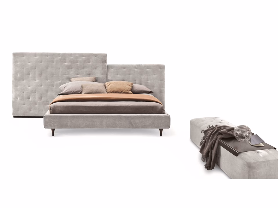 The Ecléctico bed can be customised to suit individual requirements. Various headboards are available, some of which can be fitted with a shelf used as a bedside table. as well as numerous accessories specifically designed to match the bed such as the pouf or the quilted bench and the wooden bedside table. Ecléctico can be chosen with different types of headboards available in the right or left version that can be combined with a floor-standing bed frame or a raised one on tapered feet.