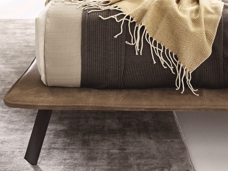The elegant looks of the Kanaha bed depend on the materials employed for it. The metal feet blend in with the slim, upholstered bed frame, creating a bed with an unmistakable style.