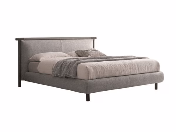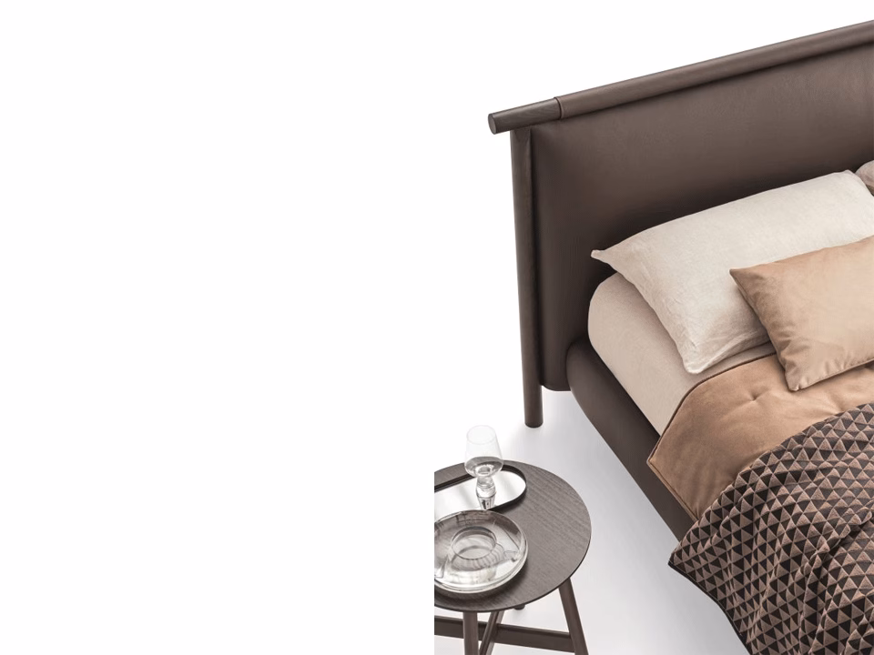The Nathan bed boasts an iconic, wooden structure upholstered with a sheet of leather on the headboard which designs and defines its shape while accommodating soft cushions and making the bed sturdy and comfortable.