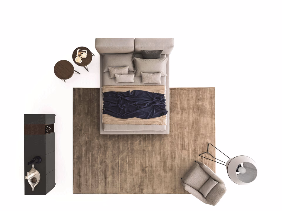 The charm of a top-design bed combines with the desire for a strictly personal world. Sound offers a balance of being fashionable and pursuing a familiar dimension. In this way, its fully upholstered headboard blends harmoniously with its more streamline structure, supported by metal feet in four finishes: chrome, white, grey and brown.