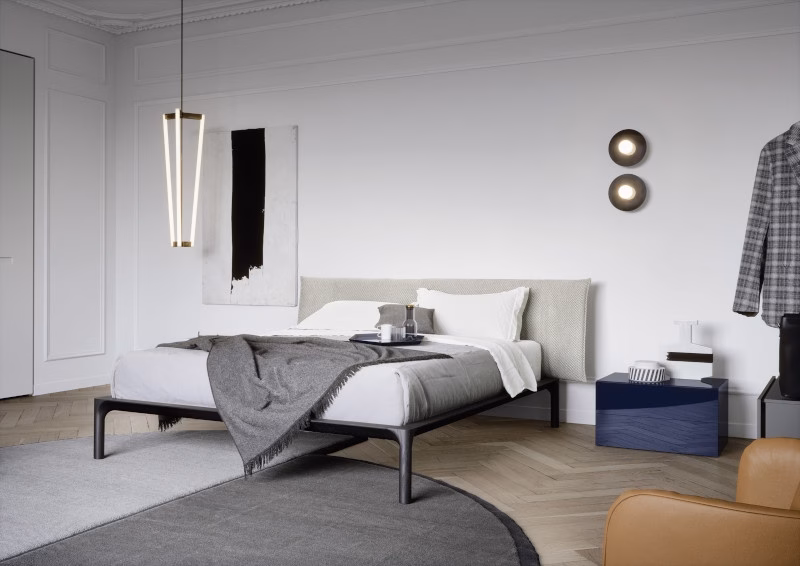 Painstaking attention to detail, lightness and character, Park is a bed featuring a headboard upholstered in fabric or leather, with a wooden bed surround.