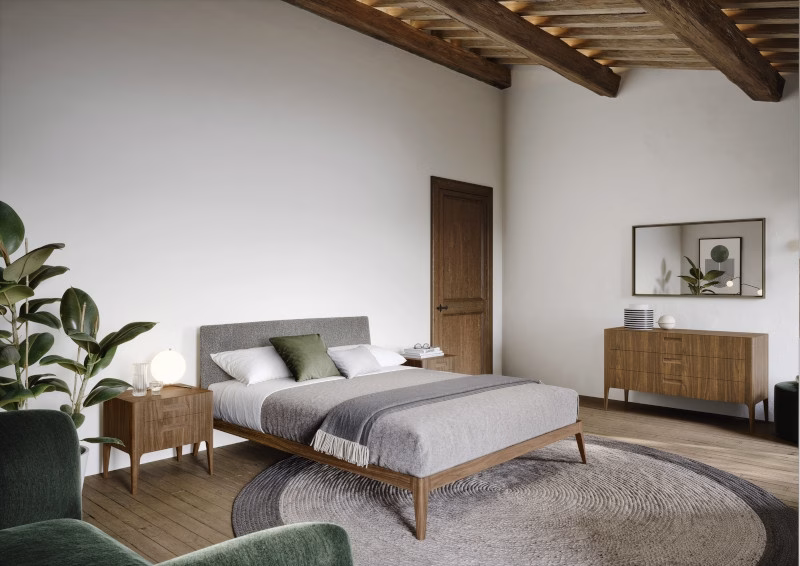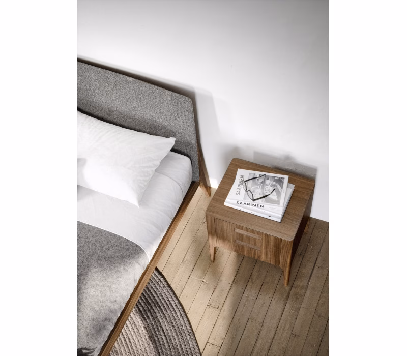 With its rounded lines, the Siri bed has a simple, timeless design. Available in veneered wood, coming in two versions: rovere terra and rovere miele. The Siri bed has rounded lines and a simple, timeless design. It comes in veneered wood in the rovere miele, terra and carbone finishes and in noce canaletto. The headboard cover comes in a choice of removable fabric or leather upholstery.