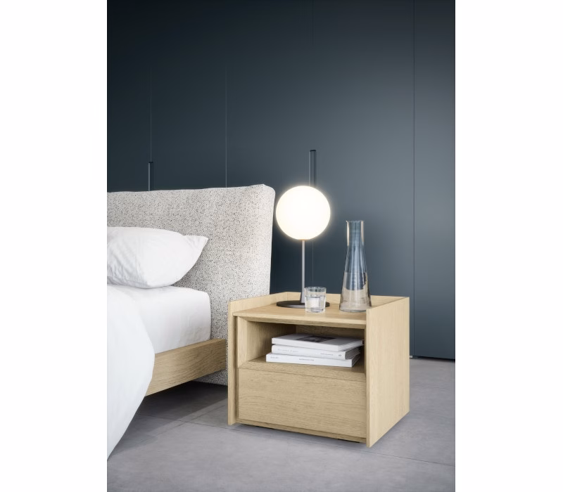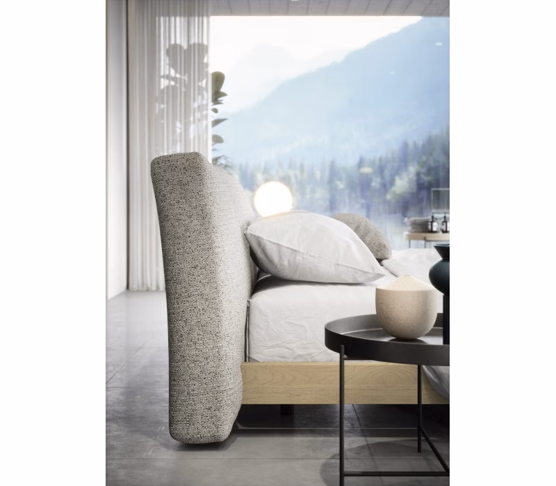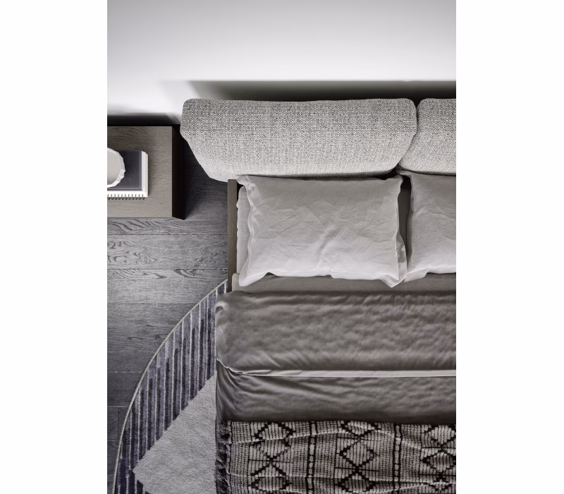 Twice is a bed whose distinguishing features are a padded headboard and a bed surround in a veneer finish. The frame’s pared-back shapes, bordering on the geometric, are softened by the headboard, comprising two generous cushions that can be upholstered in fabric or leather.