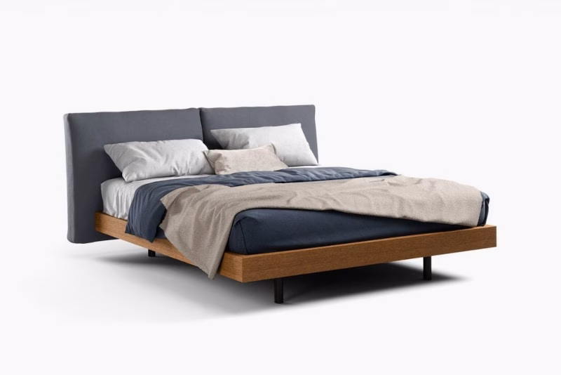 Fabric and wood come together in a modern, pared-back bed.