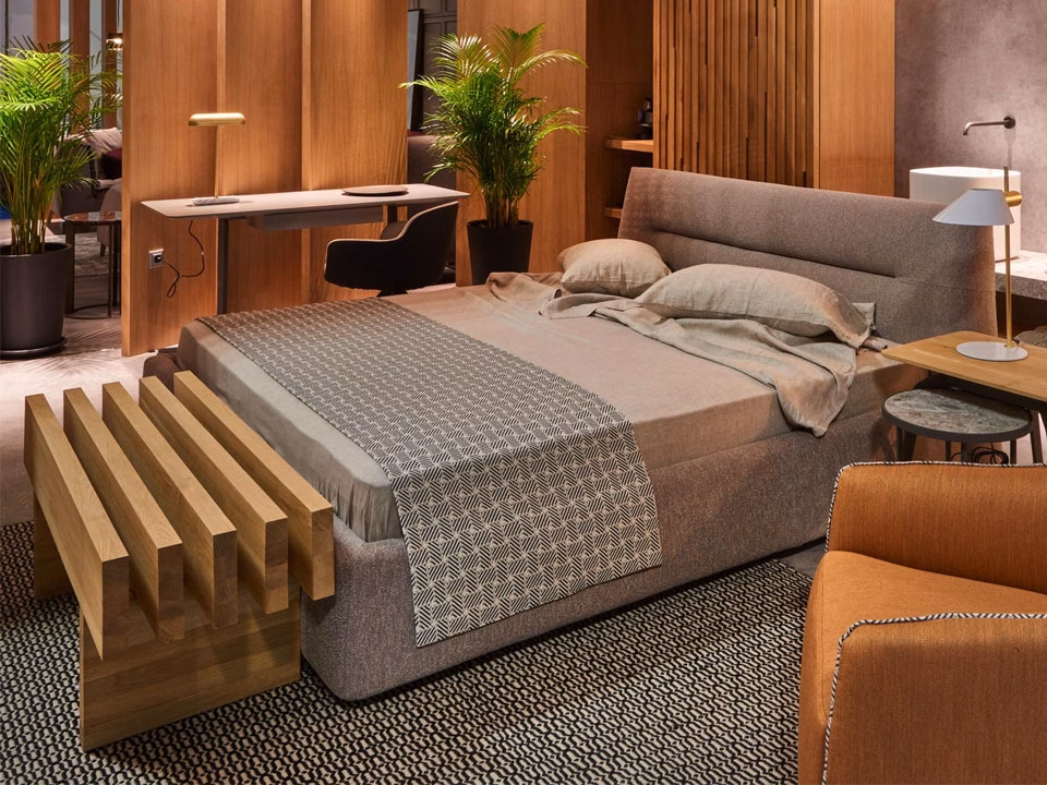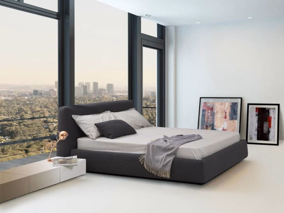 Bed with padded frame and headboard, removable fabric or leather. the frame can be disassembled. storage system under the mattress is optional.