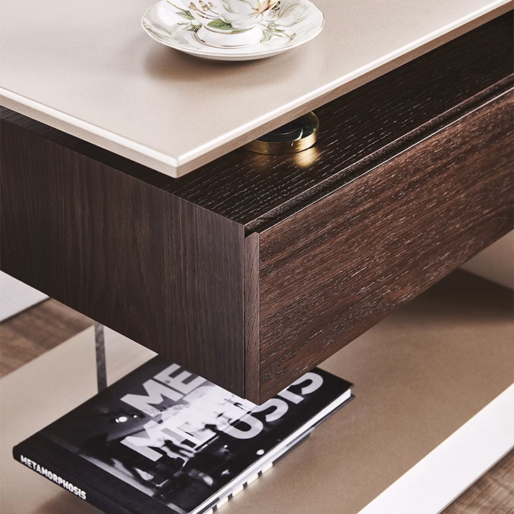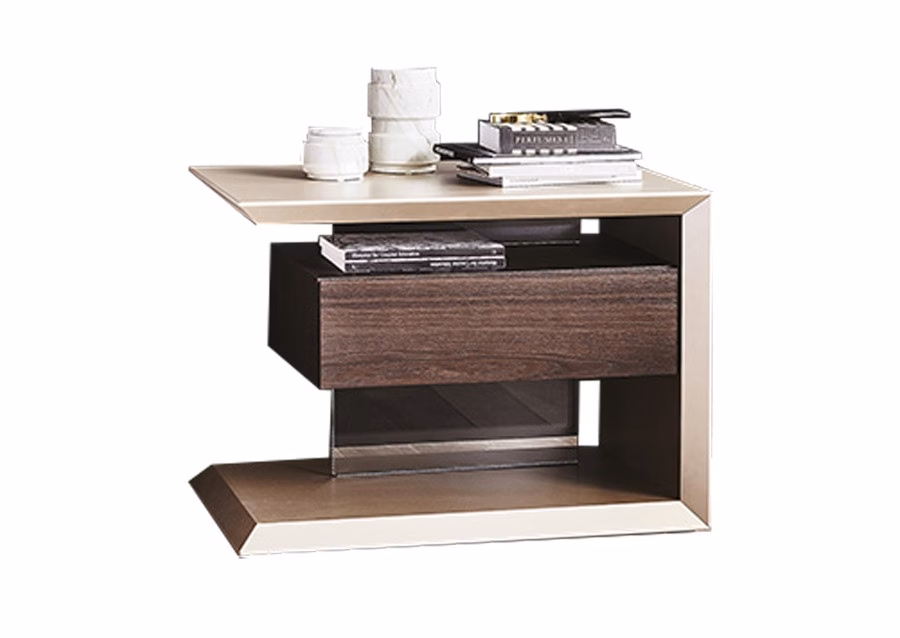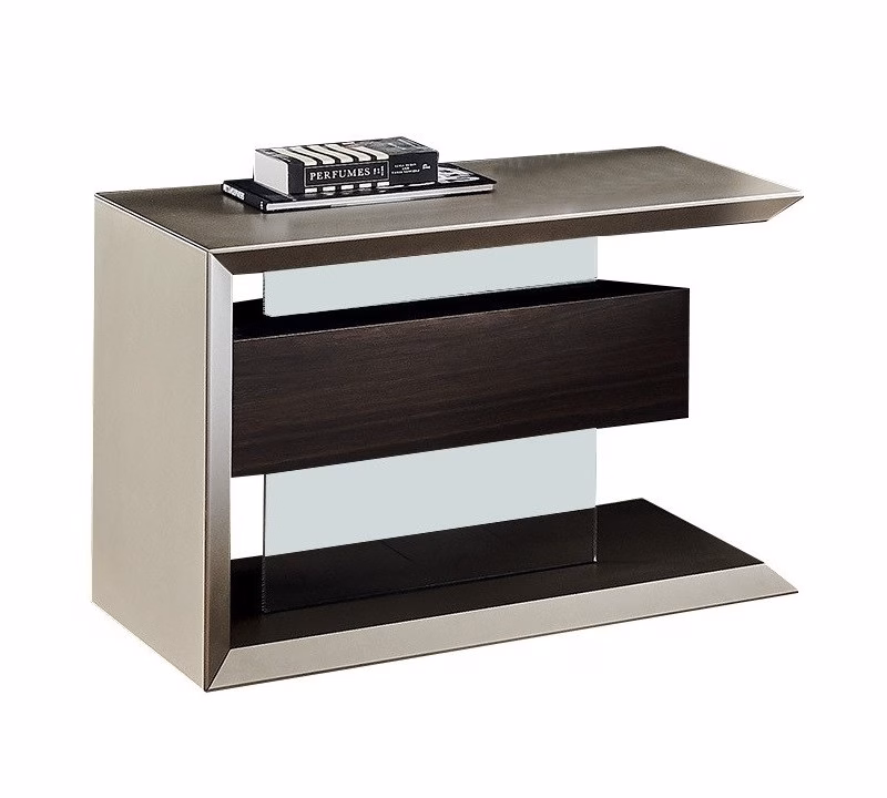 Reversible nightstand with titanium (GF11), graphite (GF69) or white (GF71) embossed lacquered frame. Drawer unit in Canaletto walnut (NC) or burned oak (RB).