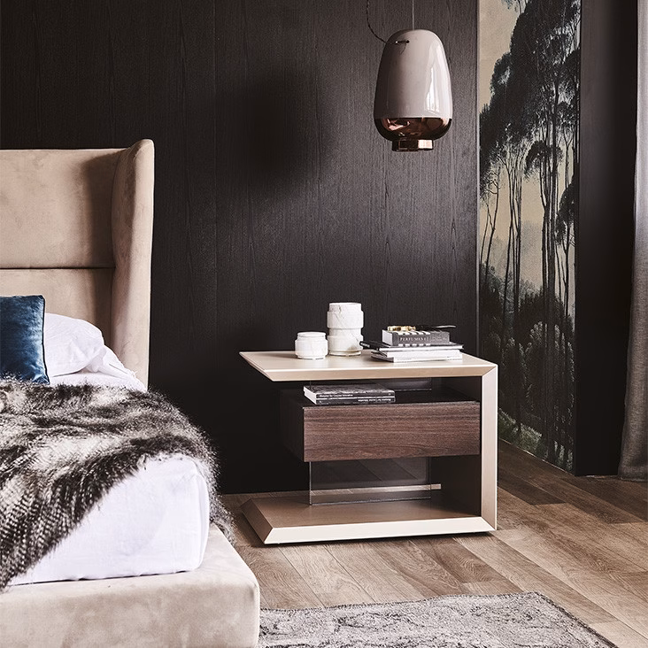 The Biagio designer nightstand combines geometric shapes and different materials, forming a unique and functional modern nightstand. The external structure is made of lacquered wood, while the drawer showcases the exquisite natural wood. The transparent methacrylate below acts as a refined base, dividing the lower shelf into two compartments. The bedroom collection by Cattelan Italia consists of modern nightstands and designer double beds. It has been created to complete a modern bedroom with charming design pieces.