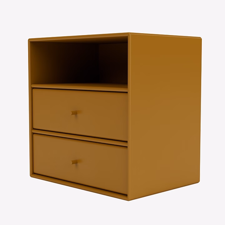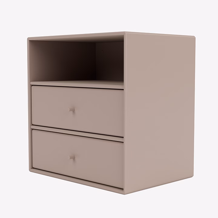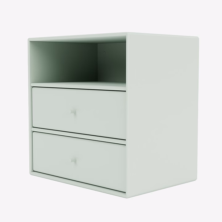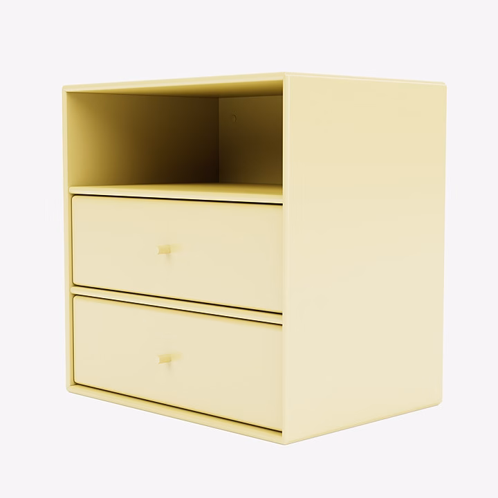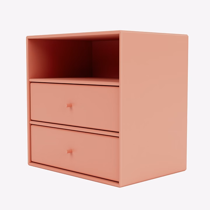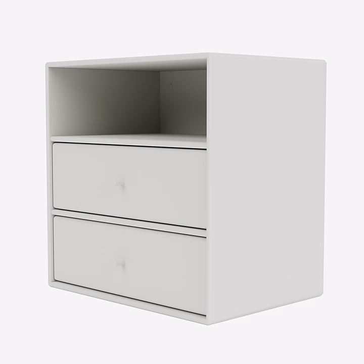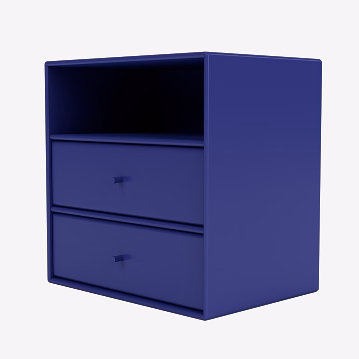 Montana Mini with shelves and two tray drawers. The tray drawers can easily be removed from the module and fit into all three spaces. The module can be used with or without the tray drawers. The tray drawer is white with a lacquered front in the same colour as the module.