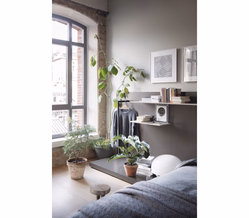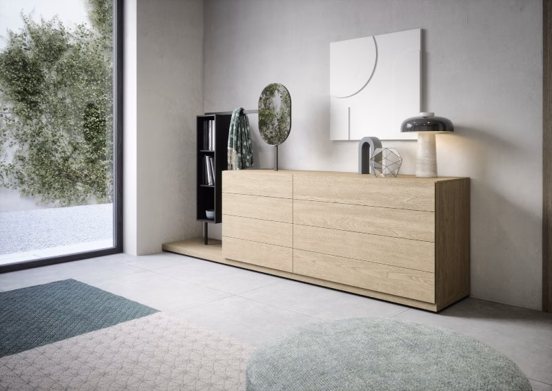 Easy System is a design that stands out for its pared-back look and impressive versatility. Drawer units and bedside tables become part of a larger system that can also include floor benches, clothes racks, mirrors, open shelving, freestanding arrangements, desks, Box 12 and Tetris storage units, creating endless furniture solutions. Each of the system components can be customized with an extensive range of finishes to choose from. Easy can also be ordered with undermounted wireless charging.