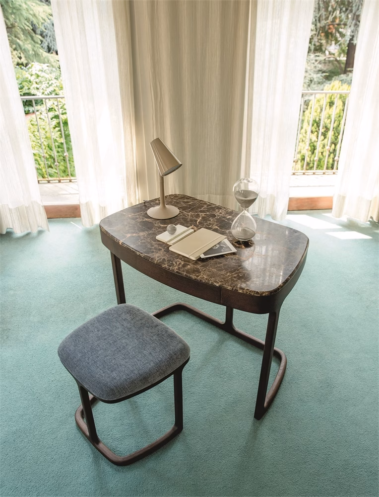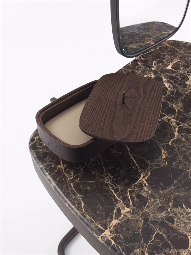 Dressing table in solid ash wood with marble top and central drawer. Matching stool and swiveling mirror with drawer available as option.