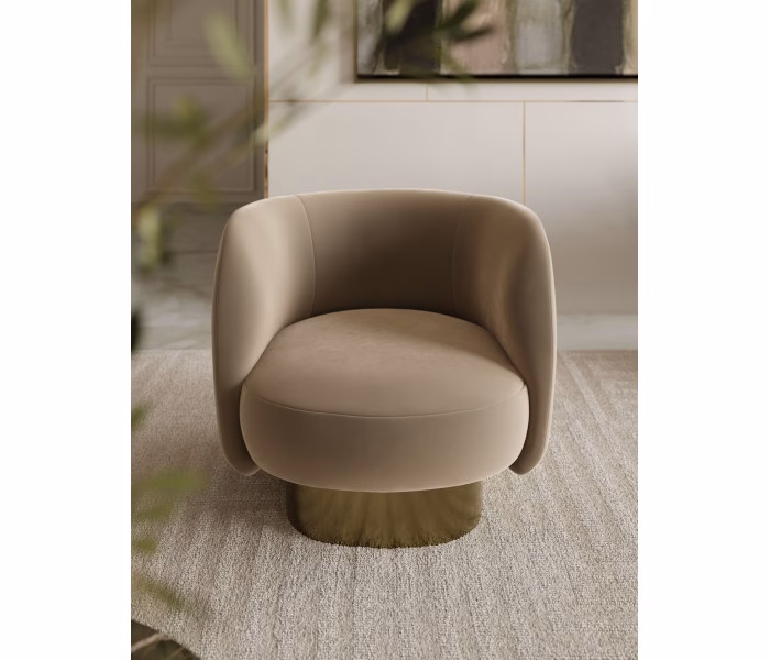 Doris exudes voluminous elegance and soft minimalism, making it a standout addition to any living room or bedroom. However, its allure extends beyond residential settings; it serves as a captivating focal point in lobbies, waiting rooms, or any public space. The compact yet wide, enveloping silhouette beckons relaxation and ensures utmost comfort. Supported by a fixed cylindrical metal base, the armchair boasts a rotational axis, complemented by a return swivel function. Doris epitomizes harmonious simplicity, balance, and softness, making it a captivating addition to any space