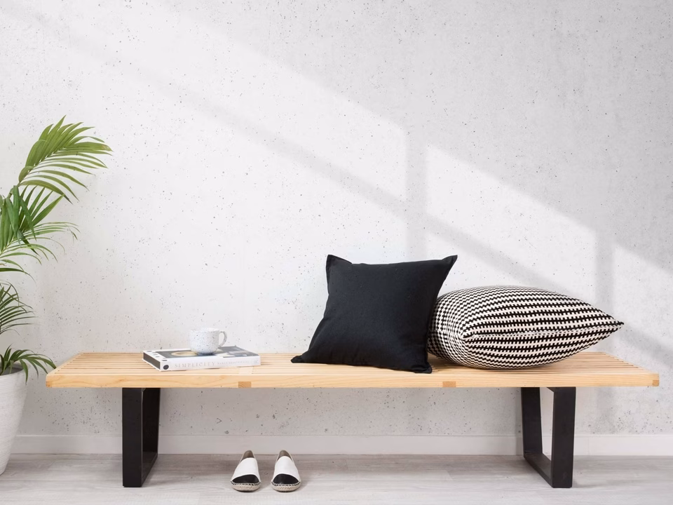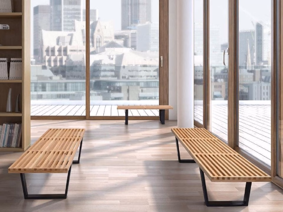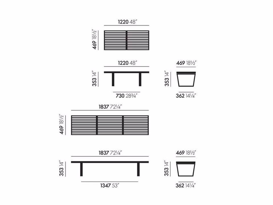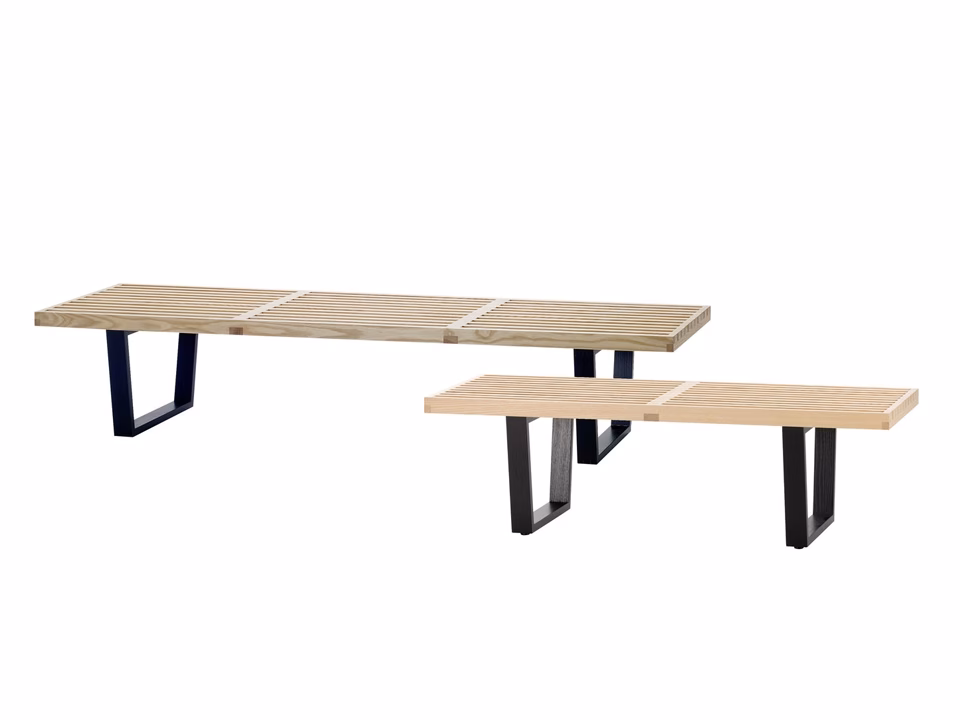 The Nelson Bench is made of ash, combining the natural colour of the seat with a black finish on the base. Its clean linear aesthetic underlines the architectural background of the designer, George Nelson. It can be used as a bench or low table and is available in two different lengths.