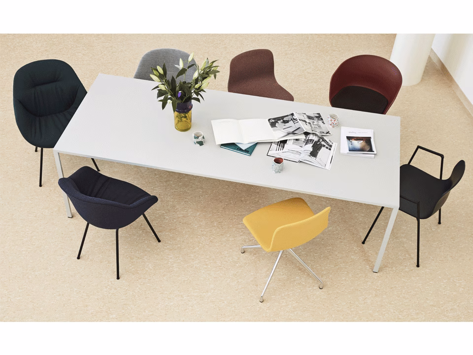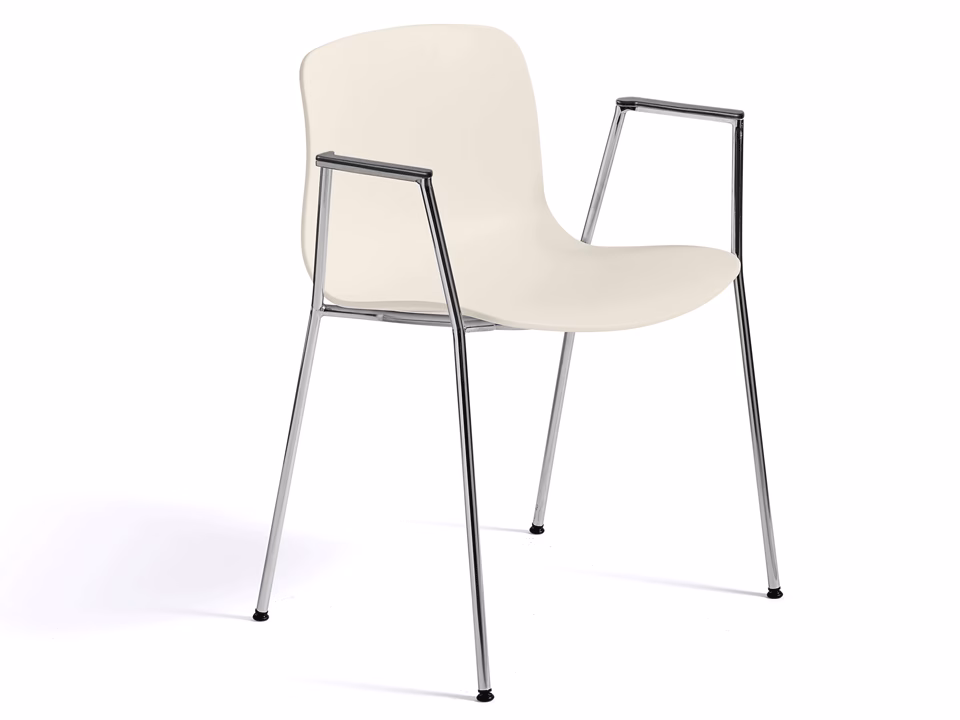 Offering a slightly more formal flavour than the rest of the series, About A Chair AAC 18 features slim, elegant legs and armrests that frame the seat shell. The chair’s upright, slightly rounded seat offers excellent comfort, while the open front conveys a welcoming expression. Its refined silhouette makes it a perfect conference chair, but is also suitable for dining tables or home offices. The legs are available in chrome and powder coated finishes, while the shell comes in diverse colour and upholstery options, allowing a multitude of design combinations that make this series so versatile.