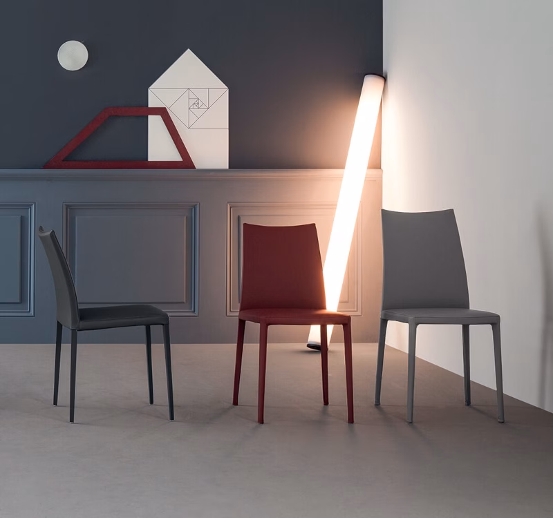 The chairs in the Kayla collection are upholstered in leather, eco-leather or fabric and are available in different versions, which can be combined between each other for a functional and aesthetically consistent result: Kayla (with low backrest), Kayla up (with high backrest), Miss Kayla (with armrests) or Miss Kayla up (with high backrest and armrests). They are available fully upholstered or in the variant with visible legs, in painted metal, chrome or black nickel. Comfort, aesthetic value and flexibility of use allow the seats of the Kayla collection to integrate diverse styles and worlds, from the pleasures of the table in the company of others to convivial meetings, to private or contract contexts. Merit of a timeless design, full expression of the Bonaldo design philosophy.