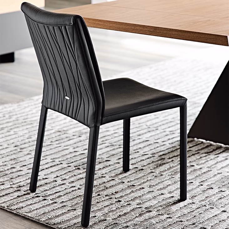 Chair with steel frame completely covered in fabric, synthetic nubuck, micro nubuck, synthetic leather or soft leather as per sample card. Quilted seatback cover. The cover is not removable.