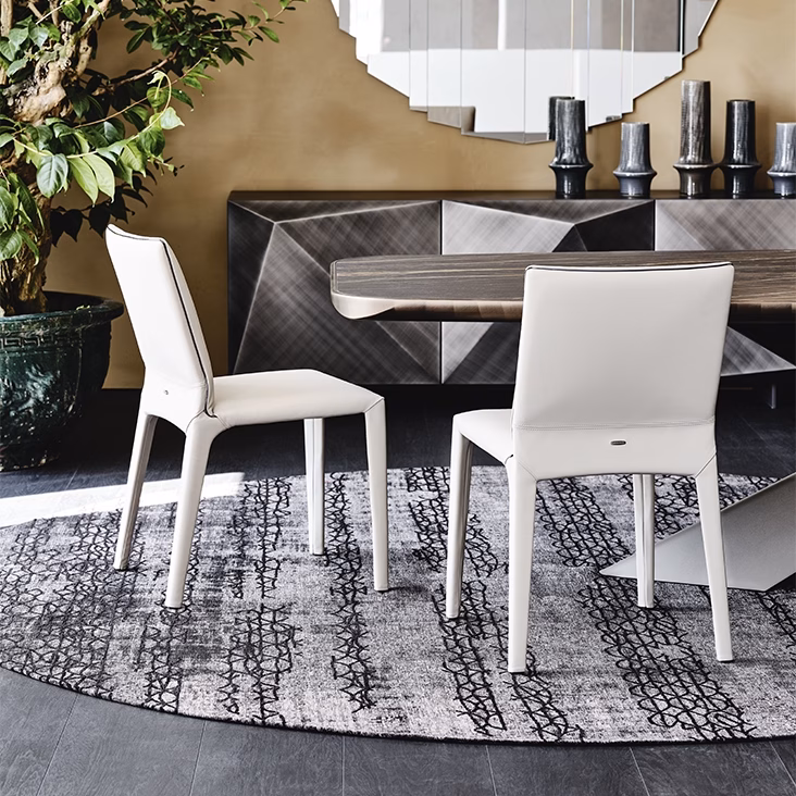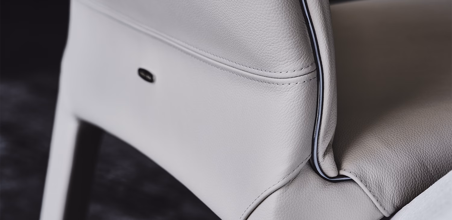 Upholstered chair with steel frame and covered in synthetic leather, fabric, synthetic nubuck, micro nubuck or soft leather as per sample card. Piping gun metal grey color. The cover is not removable.