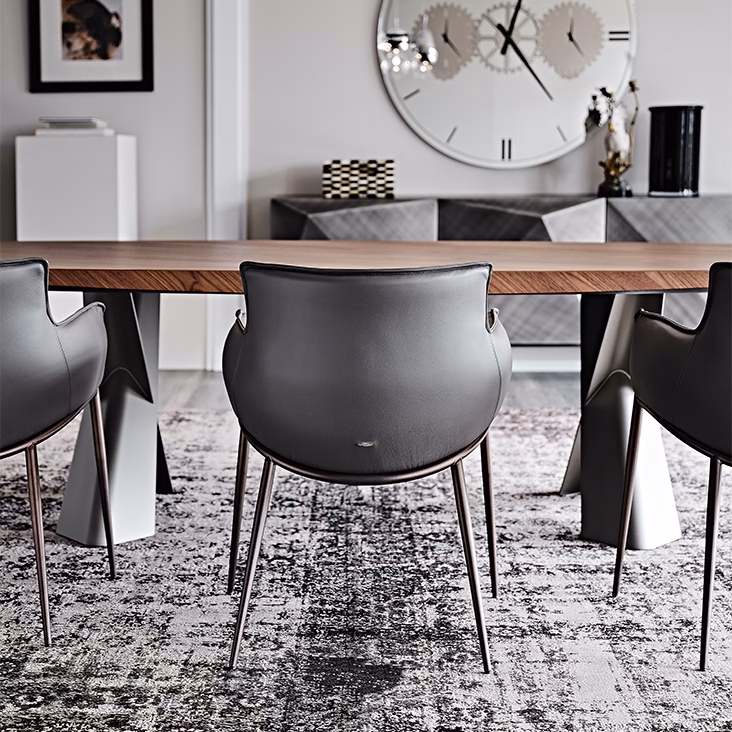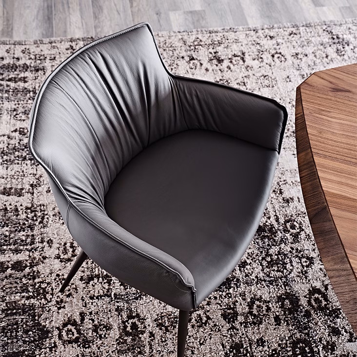 Chair with frame in titanium (GFM11), bronze (GFM18), graphite (GFM69) or black (GFM73) embossed lacquered steel. Cover in fabric, synthetic nubuck, micro nubuck, soft leather or synthetic leather as per sample card. The cover is not removable.