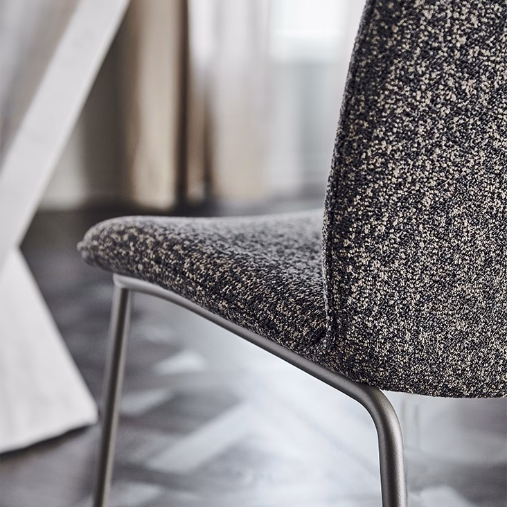 Chair with frame in titanium (GFM11), bronze (GFM18), graphite (GFM69), white (GFM71) or black (GFM73) embossed lacquered steel. Cover in fabric, synthetic nubuck, micro nubuck, soft leather or synthetic leather as per sample card. The cover is not removable.