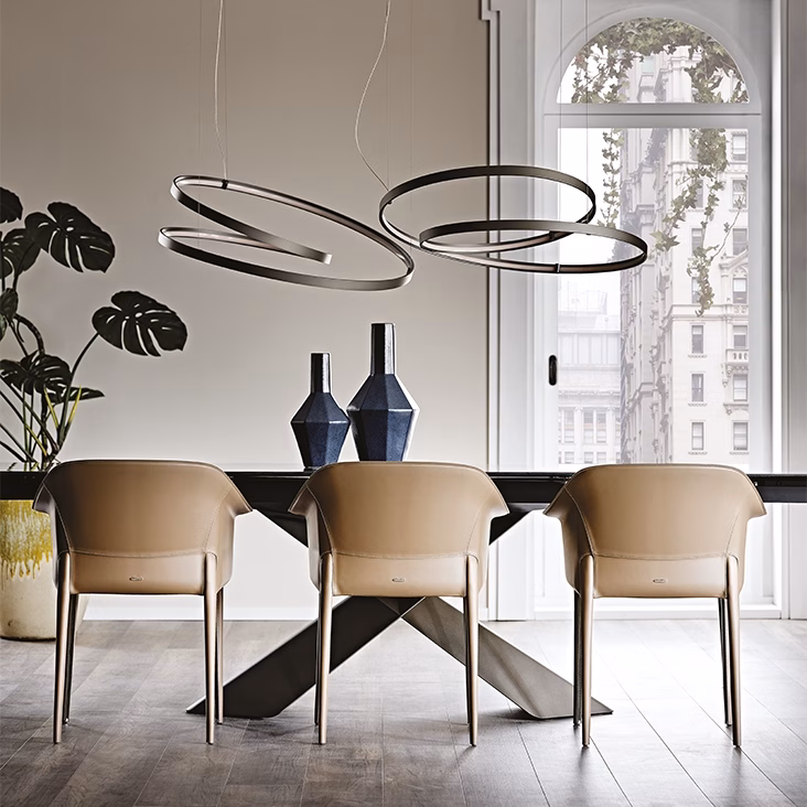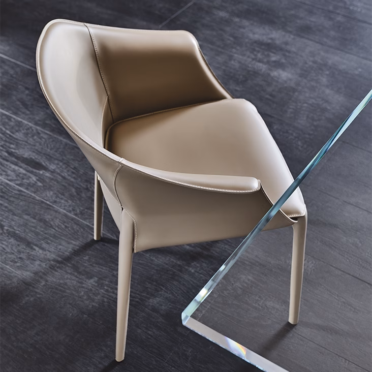 Chair with metal structure. Cover in leather as per sample card. Matching stitching and profile.