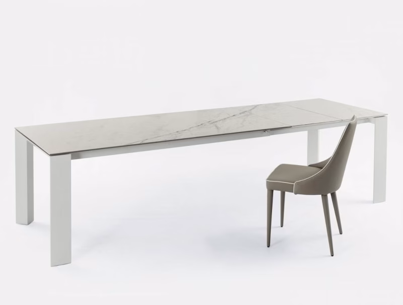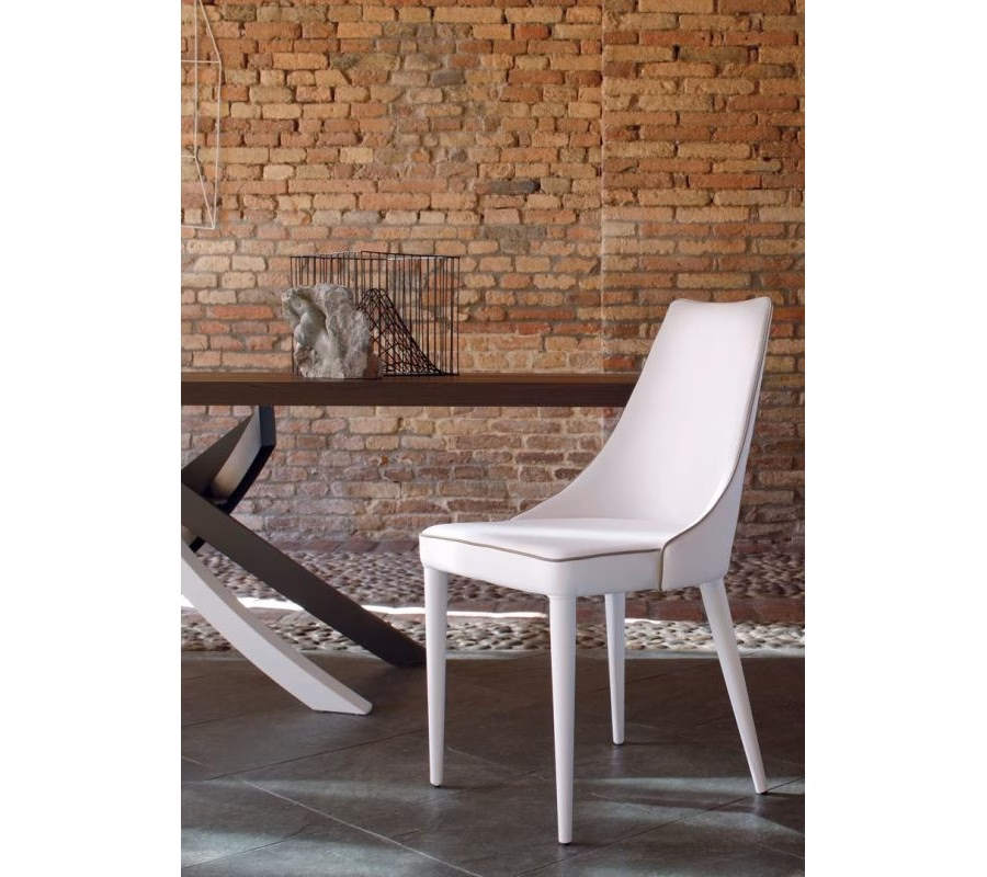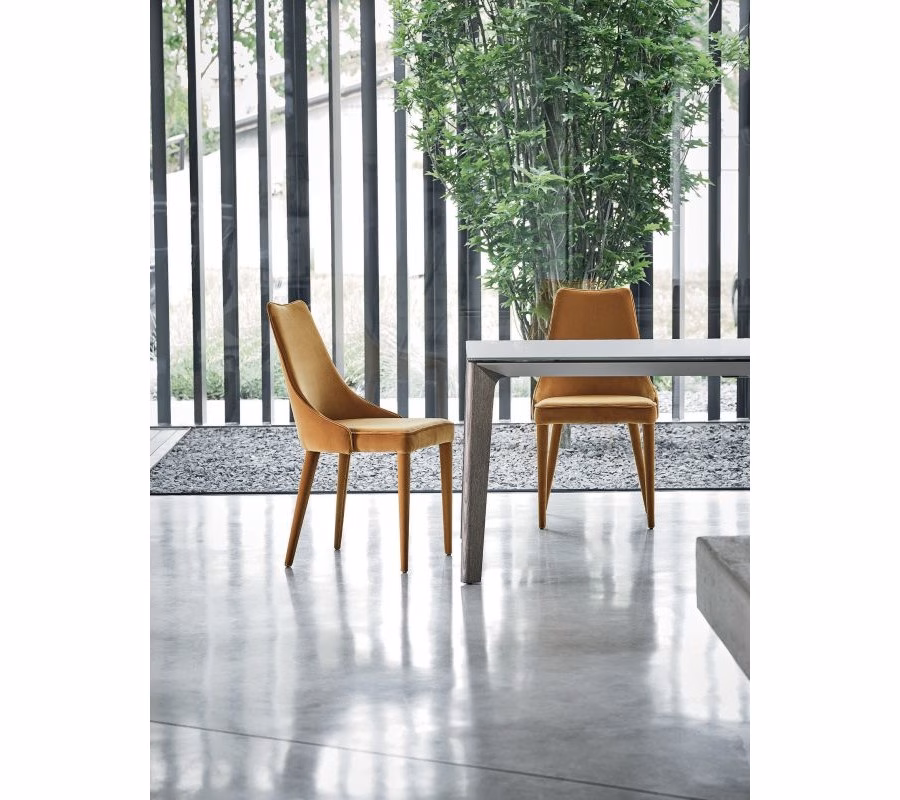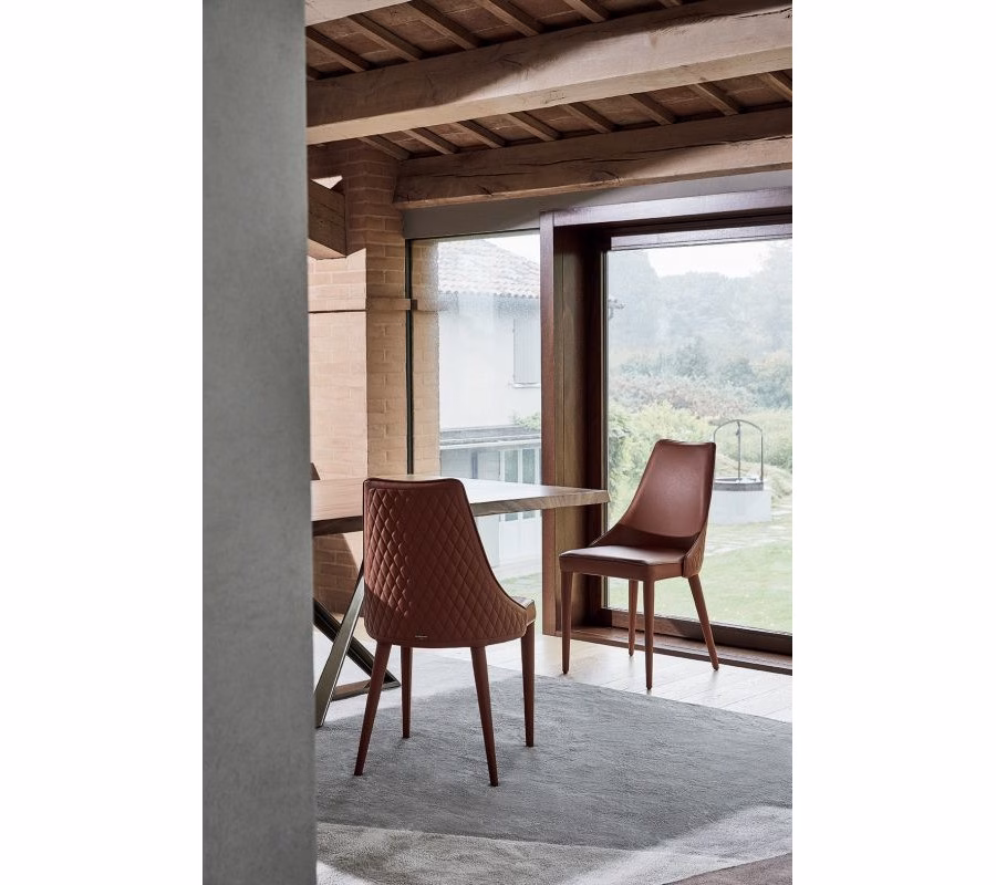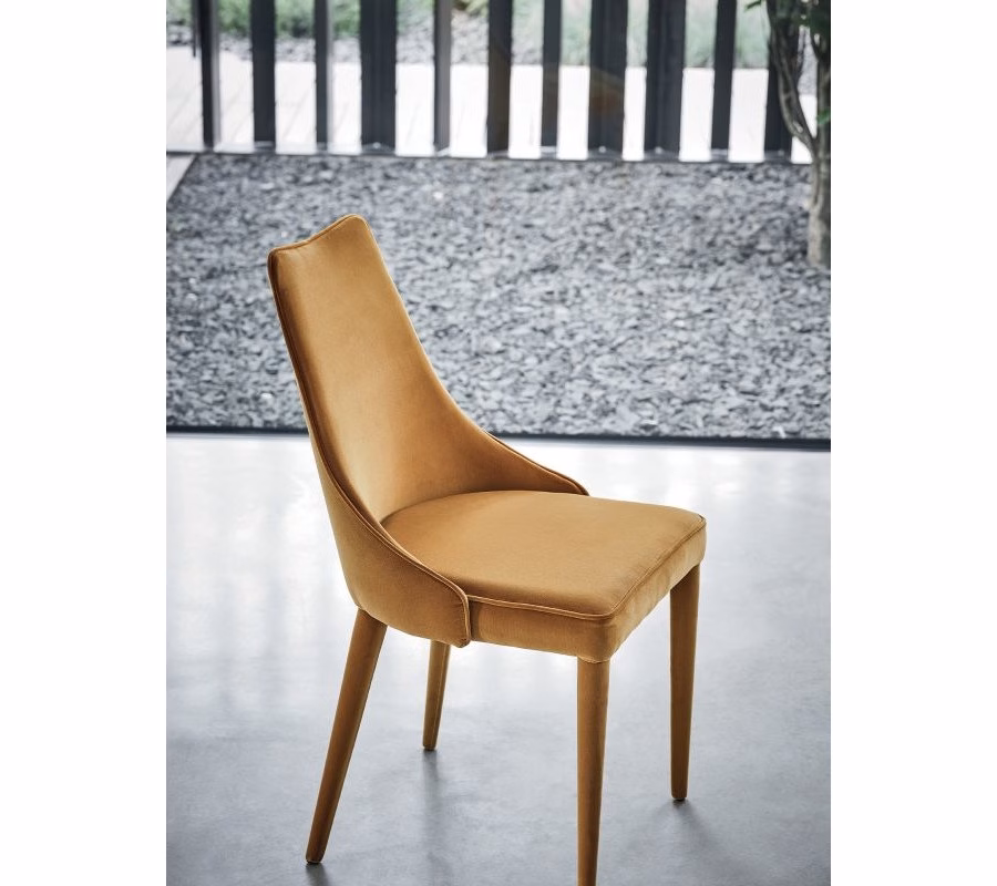 Chair with Metal frame upholstered and covered in Eco leather, Premium Eco leather, Technical velvet, Mambo and Lulù fabric, Waterproof Nabuk, Pure Virgin Wool, Velvet, Decò fabric and Premium Nappa Leather. Also available in the version with quilted backrest (only for Waterproof Nabuk, Eco leather and Premium nappa leather). Also available in the version with quilted backrest (only for Waterproof Nabuk, Eco leather, Premium Eco Leather and Premium nappa leather).