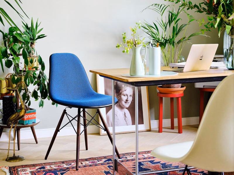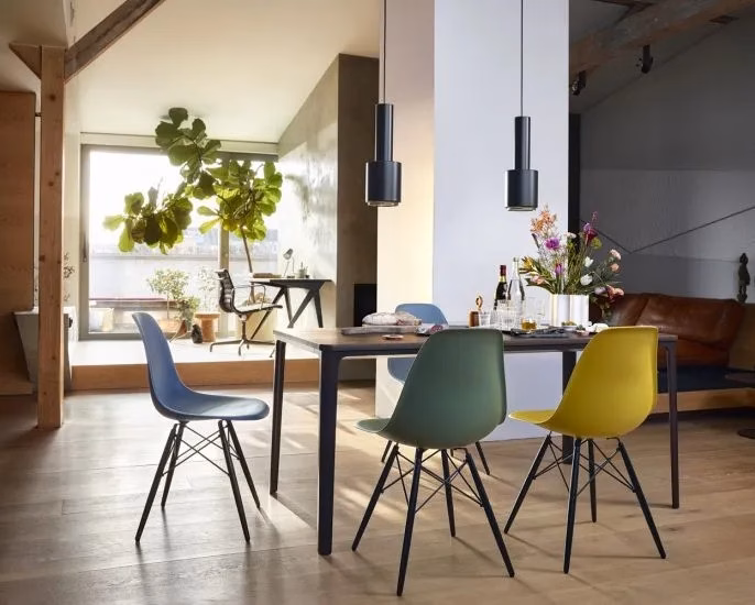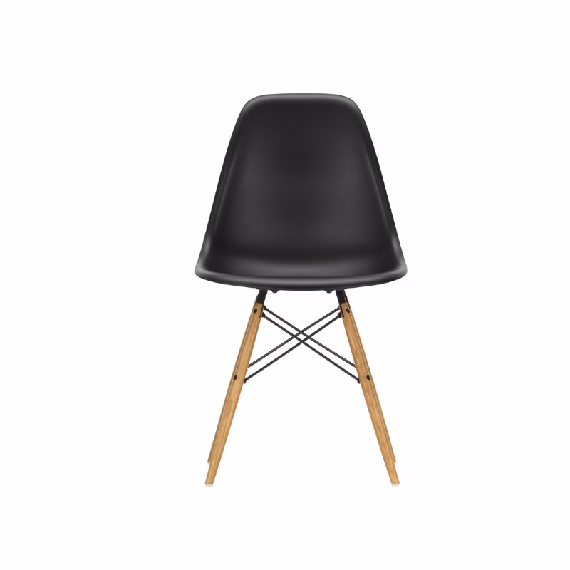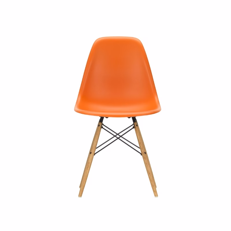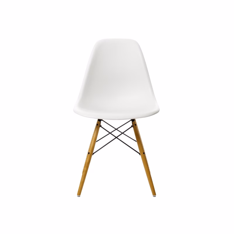 For the Dining Height Side Chair Wood Base (DSW), Charles and Ray Eames combined the organically shaped seat shell with a four-legged wooden base. This mix of plastic and wood lends the classic design a certain warmth and casual appeal. The seat shells can be fitted with seat cushions or full upholstery in a wide selection of fabric colours, enabling a multitude of individual configurations.