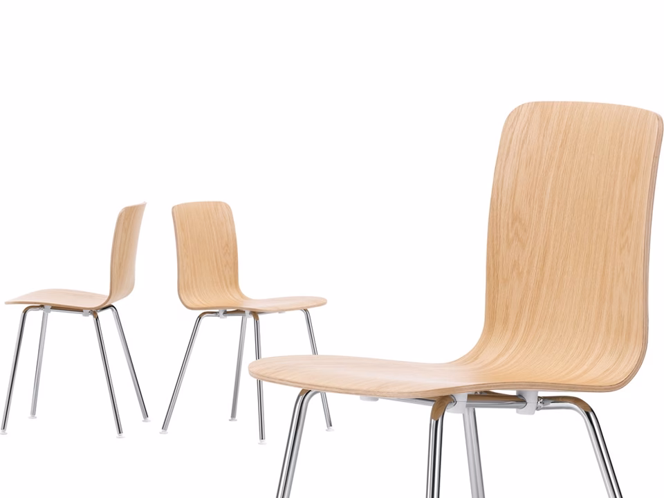 The combination of a plywood seat shell and an understated four-legged base in chrome-plated or powder-coated tubular steel makes HAL Ply Tube one of the most elegant and highly versatile versions in the HAL family of chairs by Jasper Morrison.