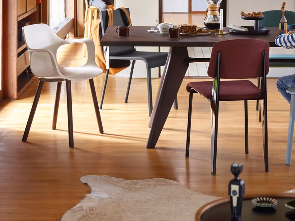 Standard SP (Siège en Plastique) builds a bridge from past to present, giving this iconic chair a contemporary look without altering its form: made of robust plastic, the seat surface and backrest of Standard SP come in a palette of finely modulated colours. The durable matt finish of the powder-coated bases matches the plastic surfaces of the chair.