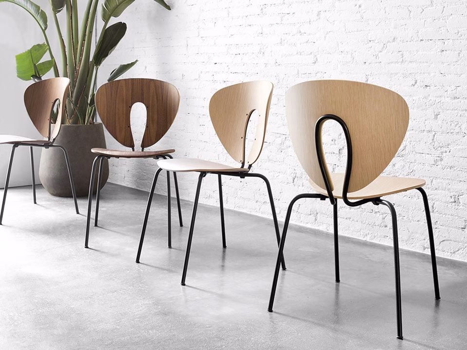 Globus chair is a light stackable chair with a refreshingly original design. The curved shape of both chair backrest and seat offer an exceptionally comfortable seating position. The expressive, even voluptuous lines of the whole chair are beautifully crafted and smoothly integrated to constitute a design that looks perfectly finished from every angle. The metal structure is available in chromed-steel or stainless steel, with well-finished smooth curves and quality fittings. The seat and backrest are made of veneered multiply, finished in natural wood, wood lacquered or in polypropylene.