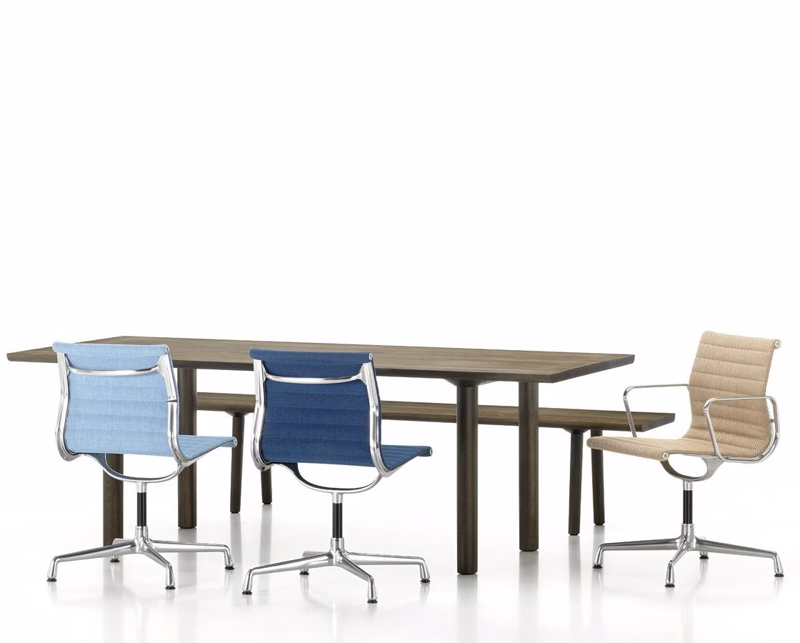 The Aluminium Chairs EA 101 Charles and Ray Eames are ideal for using in combination with tables: in comparison to the other models in the Aluminium Group, they are somewhat lighter, narrower and higher. Thanks to the wide selection of subdued or bright upholstery colours, it is easy to find the perfect chair for any dining room interior. The three models differ in the type of base – fixed or swivel – and whether they come with armrests.