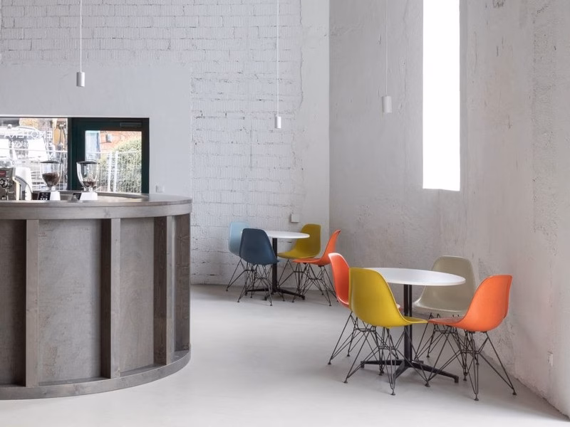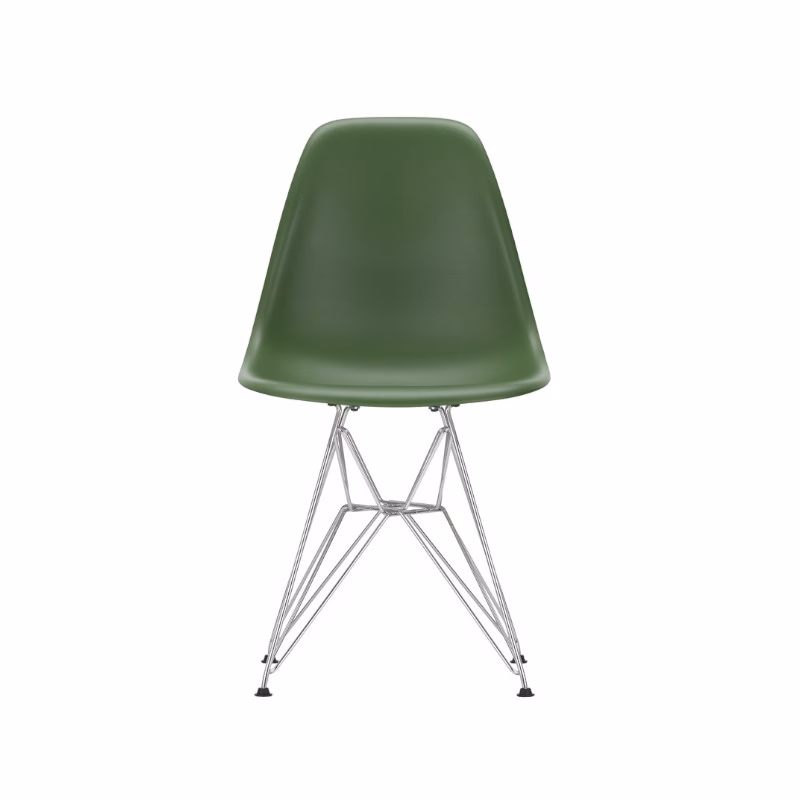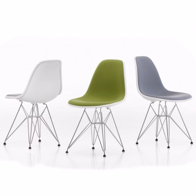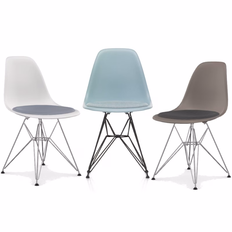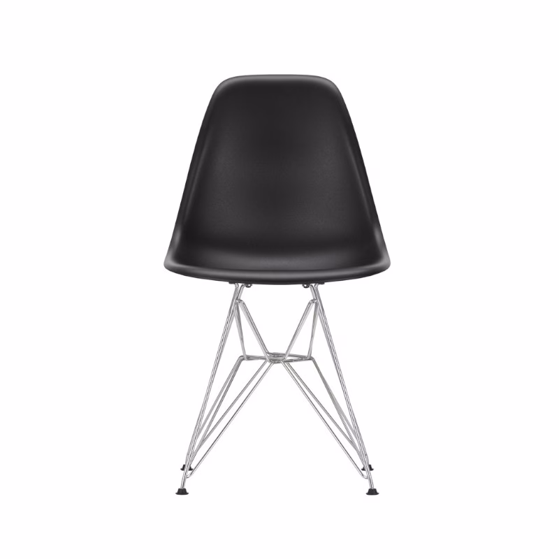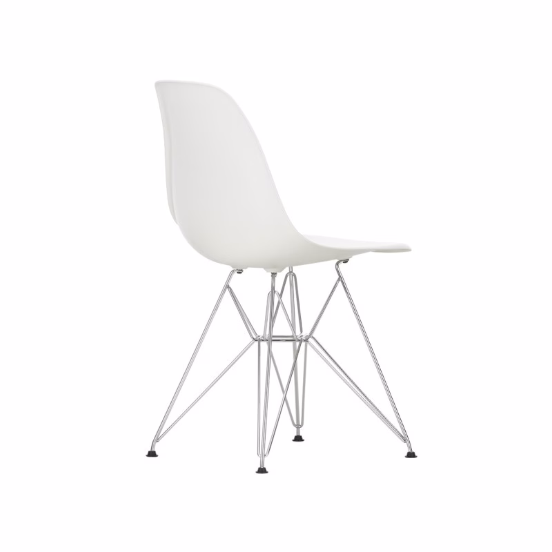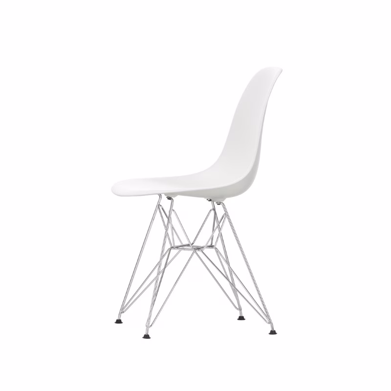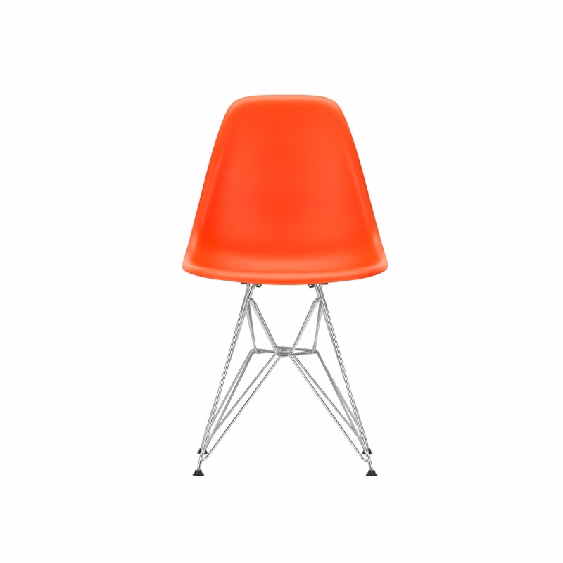 The so-called Eiffel Tower base of the DSR chair (Dining Height Side Chair Rod Base), an intricate and graceful construction made of steel wire, combines light, elegant forms with structural strength. The organically shaped plastic seat shell is available in various colours and upholstery options, allowing this distinctive classic by Charles and Ray Eames to be adapted to a wide range of individual needs and preferences